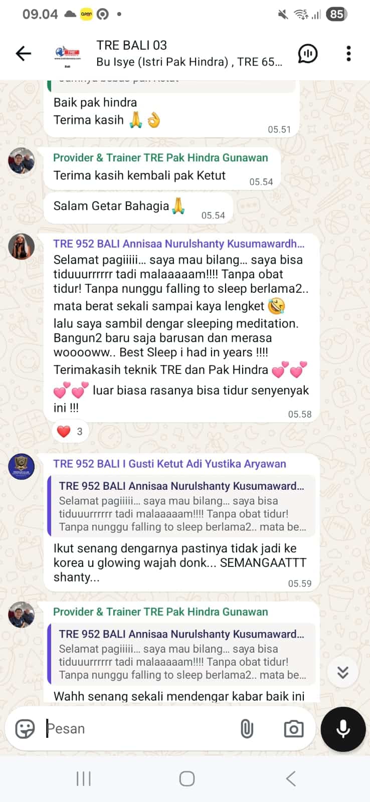 Tidak ada garansi durasi pulih, karena TRE BUKAN CARA INSTAN UNTUK SEMBUH. Yang kami bisa lakukan hanya mengulurkan tangan dan memberikan “jalan” melalui teknik yang terbukti dan komunitas + pendampingan dalam perubahan hidup menuju kesehatan dan kebahagiaan Anda.